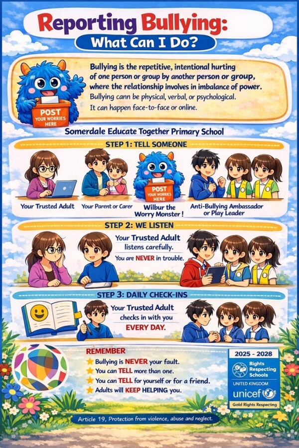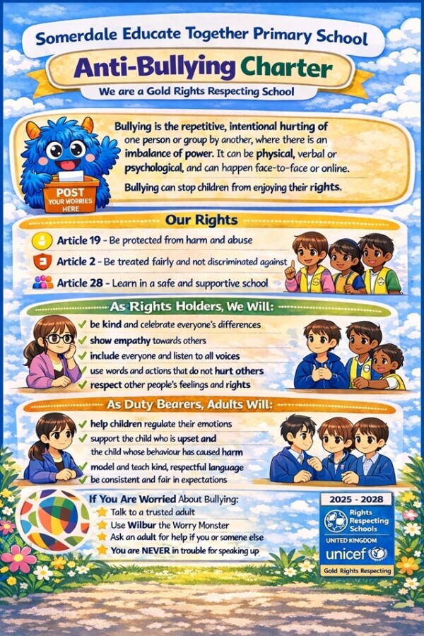 Bullying is never ignored at Somerdale Educate Together. All concerns are listened to carefully and acted upon.
